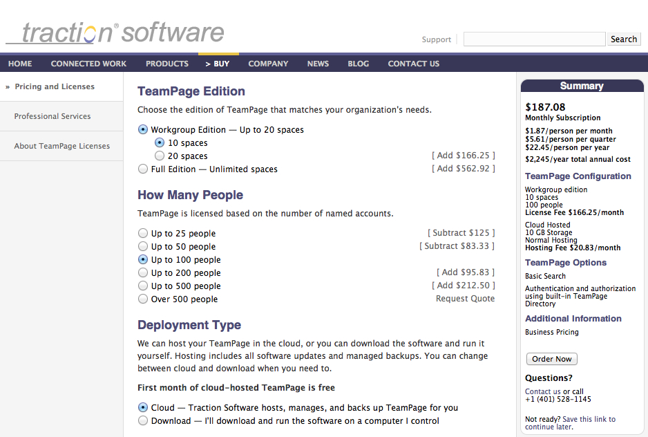 Thanks to Jacob Morgan, Chess Media Group for his Tweet this afternoon while we were chatting on the phone. Last October Jacob reviewed Traction TeamPage in his Emergent Collaboration Vendor series, and liked what he saw, including TeamPage pricing. He said: "I had the pricing explained to me so I understand it but I think it would be helpful if they made it easier to understand for all site visitors because it really does make sense." We agree on both points! In updating the Buy page, Chris Nuzum used Apple Store product configuration pages as benchmarks for clarity and ease of use.