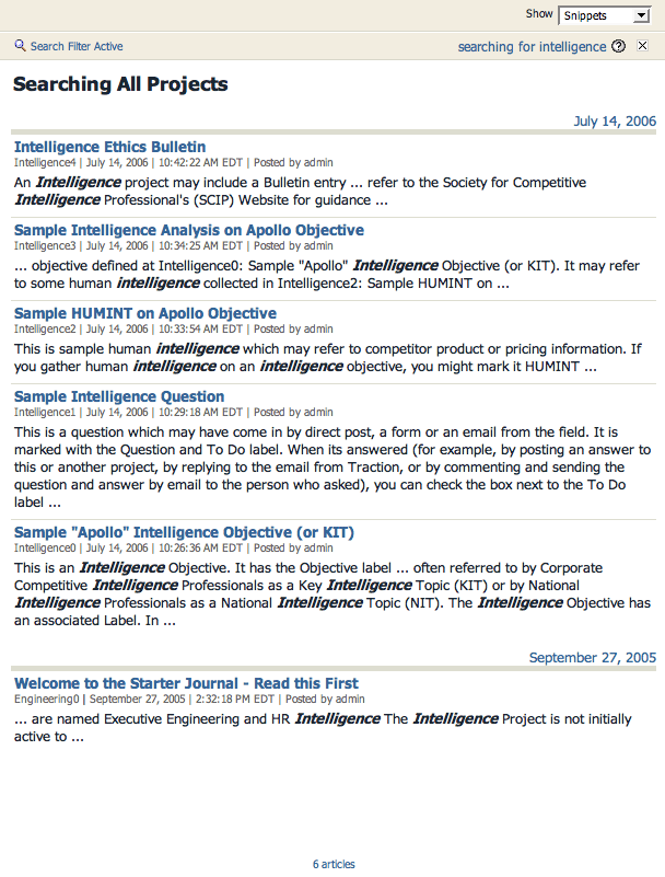 In this example, the system was searched for the word Intelligence and 6 results appear.
