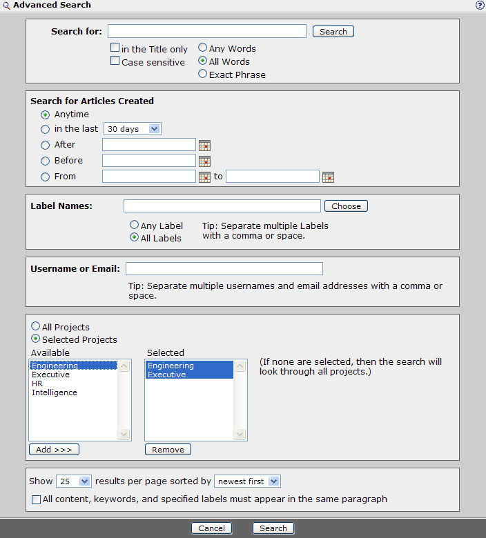 You can search by title, text, author(s), date(s), tags(s) and spaces(s). Search capabilities allow for wild cards, boolean search and even paragraph matching. All search results are automatically permission filtered - every user see the set of results they have permission to read.